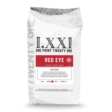 One Point Twenty One Red Eye is a modern take of an Italian classic, and can be enjoyed as both a drip coffee and an espresso. All of the coffee beans used in this blend were selected to bring out the caramel and nutty notes and its sweet, buttery finish. The beans used in this blend were hand picked from high-altitude farms in Latin America. The sweet caramel tasting notes and nutty & berry hints in these Red Eye whole beans makes both a great cup of coffee and a delicious espresso. This I.XXI Red Eye Coffee is a direct replacement for our Brewology Red Eye Coffee.