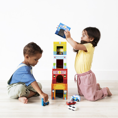 Beep, beepwatch out, this city is bustling! Your mayor-in-training is going to love stacking familiar community buildings sky high. With 5 cardboard blocks for kids and 5 wooden cars with working wheels, kids can spend hours playing in their very own busy city.