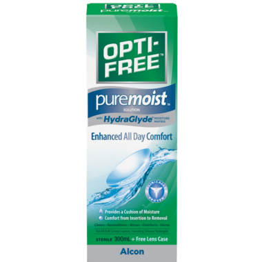 Opti-Free Pure Moist is a Multi-Purpose Disinfecting Solution for comfort and moisture from insertion to removal. Removes protein deposits and reduces lipid deposition for silicone hydrogel and soft contact lenses. Cleans. Recondition. Rinses. Disinfects. Stores. Sterile.