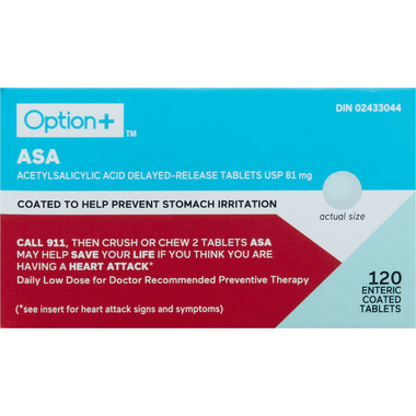 Option+ Acetylsalicylic Acid (ASA) Delayed Release USP 81 MG Enteric Coated tablets provide a daily low dose for doctor recommended preventative therapy of potential heart attacks. Each tablet is coated to help prevent stomach irritation.