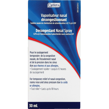 Caution: Do not use: with other decongestant products; for longer than three days; in children under 12 of age; more than the recommended dosage; if you have an allergy to any of the listed ingredients Ask doctor or pharmacist before use if you have: heart disease; high blood pressure, thyroid disease; diabetes; difficulty urinating due to prostate enlargement; are pregnant or breastfeeding. When using this product: temporary burning, stinging, sneezing or a runny nose may occur; nasal congestion may come back or get worse if you use this product for long period of time; do not share this bottle with others as this may spread germs; read the completed label prior to use and follow all label instructions. Stop use and ask a doctor if congestion persist. Keep out of reach of children. In case of overdose, call a poison control centre or get medical help right away. Store at room temperature between 15C and 30C. Keep cap tightly closed. Store in a cool, dry place. Keep this carton for future reference.