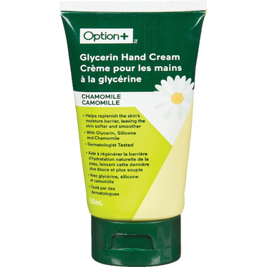 Option+ Glycerin Hand Cream is specially formulated with glycerin, silicone and chamomile which helps alleviate chapping, cracking and roughness caused by dryness.