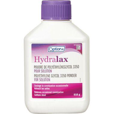 Warnings: Allergy alert: Do not use if you are allergic to polyethylene glycol; Stop use and consult a doctor if you experience an allergic reaction which may include itching, skin rashes or hives, wheezing or trouble breathing, swelling in the face. Do not use if you have a known or suspected bowel obstruction, kidney disease, unless directed by a doctor, are allergic to polyethylene glycol, are under 18 years of age unless recommended by a doctor. Ask a doctor or pharmacist before use if you have fever, nausea vomiting, abdominal pain bloating, any medical conditions are pregnant or breastfeeding, thinking about becoming pregnant are taking starch-based food thickeners for a swallowing problem. HydraLax may reduce the thickening effect of these products, which increases the risk of choking. When using this product, frequent or prolonged use may result in dependence on laxatives nausea, abdominal bloating, cramping or flatulence, diarrhea and excessive stool frequency might occur. If severe, stop use and contact a doctor, It may take up to 2 to 4 days for you to have a bowel movement do not take within 2 hours of another medicine as the desired effect of the other medicine may be reduced. Stop use and ask a doctor if you develop an allergic reaction have diarrhea and are elderly. Keep out of reach of children. In case of overdose, get medical help or contact a Poison Control Center right away.