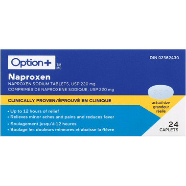 Warnings: Allergy alert: Stop use and get medical help right away if you have: hives, swelling of eyes and mouth, wheezing, shock, skin reddening, blisters, rash Stomach bleeding warning: This may cause stomach bleeding. Symptoms may include: feeling faint, vomiting blood, bloody or black stools. The chance of stomach bleeding is higher if you: are age 60 or older, have had stomach ulcers or bleeding problems, take a blood thinning (anticoagulant) or steroid drug, take with other drugs containing an NSAID like acetylsalicylic acid (ASA), ibuprofen, naproxen, or prescription anti-inflammatory drugs, have 3 or more alcoholic drinks every day while using this product. Do not use if you are: allergic to naproxen, naproxen sodium, ASA, salicylates, NSAIDs, taking ASA for preventive therapy, in your third trimester of pregnancy. If you have: ulcers or stomach bleeding, history or recurrent ulceration, inflammatory bowel disease, liver or kidney disease, right before or after heart surgery Ask a doctor or pharmacist before use if you have: asthma or diabetes, high blood pressure or heart disease, any other serious condition, take any other drug, are trying to conceive, in your first or second trimester of pregnancy or breastfeeding. When using this product: The risk of heart attack or stroke may increase if you use more than directed or for longer than directed. Stop use and ask a doctor if: pain lats more than 5 days, fever lasts more than 3 days symptoms get worse or new ones appear. Keep out of reach of children. This package contains enough medication to seriously harm a child. In case of overdose, call a poison control centre or get medical help right away