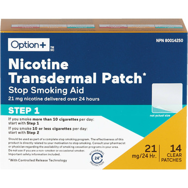 Caution: KEEP OUT OF THE REACH OF CHILDREN AND PETS. Used patches have enough nicotine to poison children and pets. -Do not smoke, use nicotine chewing gum or use any other form of nicotine while using nicotine patches. If swallowed, get medical help or contact a Poison Control Centre right away. Do not use nicotine patches if you are pregnant or nursing a child. Avoid becoming pregnant while using nicotine patches. If you think you are pregnant remove the nicotine patch and see your physician. -Do not use for more than 8 weeks without consulting a physician. Remove the nicotine patch and consult your physician if you experience irregular heartbeat, chest pain, palpitations or leg pain occurs or if severe persistent stomach upset (indigestion, heartburn) develops. - If the area under the patch becomes swollen or very red, or if you develop a rash, remove the patch and call your physician. You could be allergic to one of the components of the patch. Remove the transdermal patch 2 hours before engaging in prolonged strenuous exercise. Ask a physician or pharmacist before use if you are: - using a non-nicotine stop smoking drug. taking a prescription medicine for depression or asthma. Your prescription dose may need to be adjusted. When using this product: -Do not smoke even when not wearing the patch. The nicotine in your skin will still be entering your bloodstream for several hours after you take off the patch. If you have vivid dreams or other sleep disturbances remove this patch at bedtime. DO NOT USE NICOTINE PATCHES IF YOU: are under 18 years of age; are an occasional or non-smoker; are pregnant or nursing a child; have generalized skin conditions or allergies to adhesive tape or bandages. Ask a physician before use if you: -have ever had a heart attack, angina, heart arrhythmias or a stroke have or have ever had high blood pressure, heart disease, thyroid problems, blood circulation or stomach problems, stomach ulcers, kidney or liver disease, diabetes requiring insulin, stroke or treatment of circulation disorders of the brain, allergies to drugs, or have had any allergies to adhesive tape or bandages. -are taking any prescription medications.