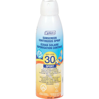 Option + Sport Continuous Spray Sunscreen SPF 30 helps prevent sunburn.