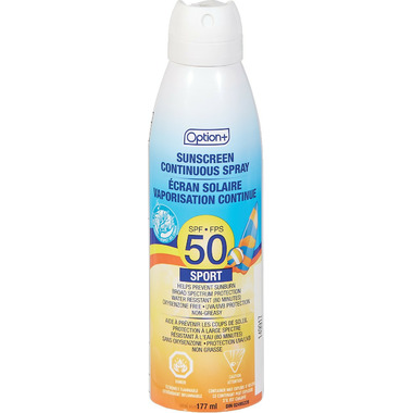 Option + Sport Continuous Spray Sunscreen SPF 50 helps prevent sunburn.