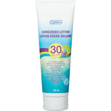 Option + Lotion Sunscreen SPF 30 helps prevent sunburn.