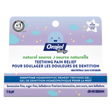Baby Orajel Natural Source Homeopathic Nighttime Teething Gel is an effective solution that helps naturally relieve teething discomfort. This special nighttime, fruit-flavoured formula is a great remedy for temporary relief of symptoms like simple restlessness and wakeful irritability due to cutting teeth. The gel contains the soothing power of chamomilla (commonly known and chamomile) and passifloria incarnata to help with restlessness and does not contain any benzocain, belladonna, paraben, sugar or dye. It is safe to use on infants one-month-old and older. Orajel is the brand that parents can rely on to help safely relieve teething pain and help establish a lifetime of healthy oral care. As babies grow into toddlers, Orajel is there to support parents from their baby's very first tooth to the first time their child brushes alone with a line of non-fluoride and fluoride toothpaste products.