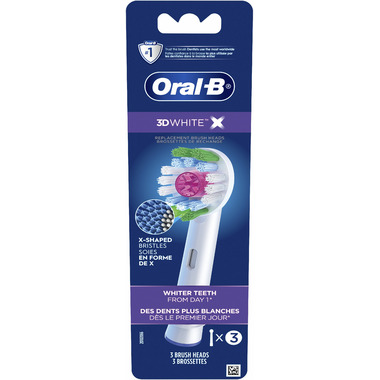 The Oral-B 3D White X-Filament Replacement Brush Heads advanced filament technology design was created to brush away plaque. This replacement brush head features a polishing cup to help remove surface stains to make your teeth whiter starting day 1. Oral-Bs 3D White Replacement Brush Head with X-Filament bristles is an ideal addition to your brushing routine by providing advanced cleaning and whitening. This round brush head is inspired by dental professional tools for a tooth-by-tooth clean with specially engineered bristles to ensure optimal coverage on every tooth. This replacement brush head has indicator bristles that signal when it is time to replace your brush head. Round cleans better* and new cleans best. A new replacement brush head removes more plaque than a worn one. This replacement brush head pack includes five genuine Oral-B 3D White Electric Toothbrush Replacement Brush Heads with X-Filament bristles. The Oral-B 3D White Electric Toothbrush Replacement Brush Heads are compatible with all Oral-B rechargeable toothbrushes, except for Oral-B iO Toothbrushes. Oral-B recommends brushing with Crest Toothpaste for optimal results. Do not use on children under age 3. Replace brush head every three months or sooner if brand head becomes worn. Oral-B: Trust the brand dentists use the most worldwide.** * Vs. a regular manual toothbrush. **Based on surveys of a representative worldwide sample of dentists carried out for P&G regularly.