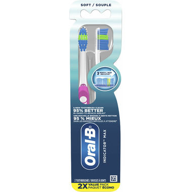 The Oral-B Indicator Max Toothbrush has color changing bristles that fade from green to yellow to let you know when it is time to replace your brush. The contour fit bristles help to remove plaque from the contours of your teeth. The gentle ended rounded bristles are designed to be gentle on your teeth and gums while providing an effective clean. For the best results, change your toothbrush regularly. A new toothbrush cleans 95% better in hard to reach areas*. Oral-B is the #1 Toothbrush Brand Used by Dentists Worldwide. Colors may vary. *vs one 3 months old; research with a flat trim brush