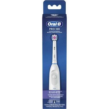 Trust the consistent battery performance of the Oral-B Pro 100 3D White Battery Toothbrush to remove plaque and whiten teeth by removing surface stains. The 3D White round brush head is inspired by dental professional tools for a tooth-by-tooth clean, with specially engineered bristles for optimal tooth coverage. This battery toothbrush is suitable for adults and kids over 3 years of age and compatible with a variety of Oral-B refill heads for every dental need.Two AA Batteries included. Replace brush head every 3 months. Oral-B is the #1 dentist-recommended toothbrush brand worldwide.