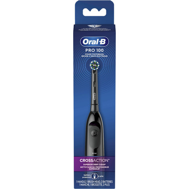 Power up to a better clean with the Oral-B Pro 100 CrossAction Battery Toothbrush featuring perfectly angled bristles to get deep between teeth. Improve your oral health by removing more plaque than a regular manual toothbrush with each use. 2 AA Batteries included. Replace brush head every 3 months. Compatible with other Oral-B Brush Heads: CrossAction, Sensitive Gum Care, FlossAction, 3D White.