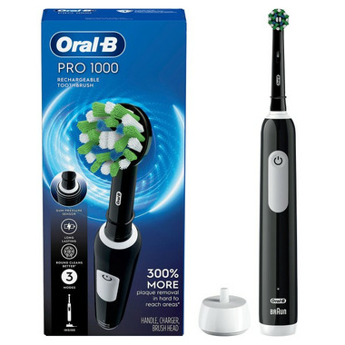 The Oral-B Pro 1000 Power Rechargeable Electric Toothbrush provides a clinically proven superior clean*. The professionally inspired design of the CrossAction toothbrush head surrounds each tooth with bristles angled at 16 degrees and removes up to 300% more plaque along the gum line*.  The brush’s 3D cleaning action oscillates, rotates, and pulsates to break up plaque.  With a built-in pressure sensor that stops the pulsation movement if you brush too hard, the brush helps protect your gums.   The brush has 1 mode, plus an in-handle timer to help you brush for a dentist-recommended 2 minutes. Best of all it is brought to you by Oral-B – the #1 brand used by dentists worldwide.
