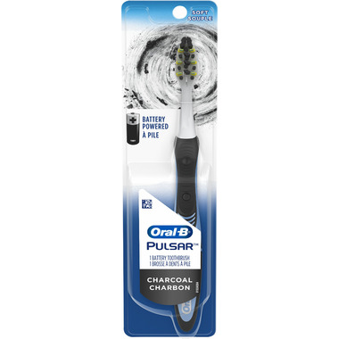 Oral-B Pulsar Charcoal infused toothbrush is battery operated to gently vibrate and polish away stains for a whiter, cleaner smile. Using the same technique to brush as a manual toothbrush, the bristles vibrate providing a gentle massaging and polishing action while brushing. The bristles penetrate between teeth where stain build-up often begins. Pulsar has soft vibrating bristles that help break up plaque between teeth. Plus, the split head design moderates the amount of pressure applied to your teeth and gums. Contouring to your unique smile, the Pulsar toothbrush will leave your smile bright and clean with every use.