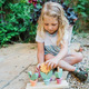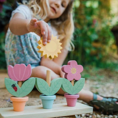 - Brightly coloured wooden stacking flower pots that support colour and shape recognition