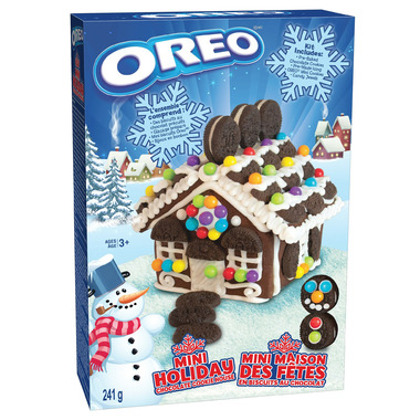 Oreo Mini Holiday Chocolate Cookie House Kit includes pre-baked chocolate cookies, pre-made icing, Oreo mini cookies, and Candy.