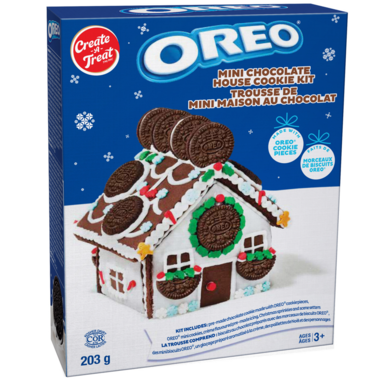Oreo mini chocolate house cookie kit. The kit includes a pre made chocolate cookie made with oreo cookie pieces, Oreo mini cookies, creme flavoured pre made icing, Christmas sprinkles and scene setters.