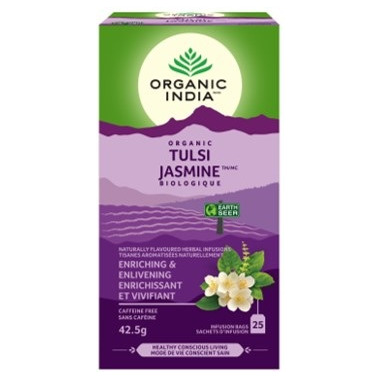 An ambrosial blend of India's beloved herb Tulsi, calming chamomile and fragrant jasmine flowers creates an enriching-tasting tea. The Tulsi herb is abundant in antioxidants and anti-inflammatory, antibacterial and antiviral properties, which help support immunity, aid digestion, and reduce stress.