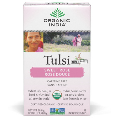 ORGANIC INDIA Tulsi Sweet Rose – a delicate blend of Tulsi finely balanced with soothing chamomile, rose petals, and the fragrant essence of rose. A rich and exotic cup of Tulsi that excites the senses.
