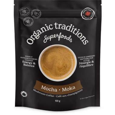 Treat yourself with Organic Traditions Mocha, 5 Mushroom Coffee Blend. Support your immune system with a delicious blend of magnesium rich cacao and five strengthening and balancing, adaptogenic mushrooms. One cup contains 80mg of caffeine from organic freeze-dried coffee. Delicately sweetened with organic coconut palm sugar and antioxidant rich monk fruit extract. Mix, whisk or blend with your milk of choice and elevate wellness routine with Organic Traditions Mocha.