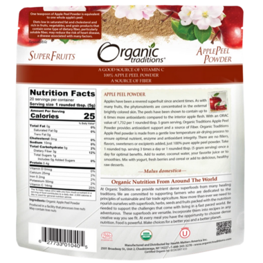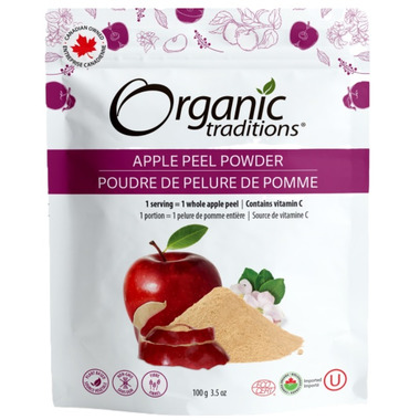 Organic Traditions Apple Peel Powder is a concentrated powder made from Certified Organic dried apple peels. The peels have been shown to contain up to 6 times more antioxidants compared to the interior apple flesh. With an ORAC value of 1,732 per 1 rounded tbsp.