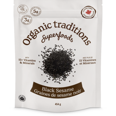 Organic Traditions Black Sesame Seeds with 15+ essential vitamins and minerals with 5g of protein.