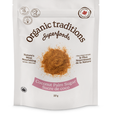 Coconut Palm Sugar is one of nature's most incredible sweeteners. Delicious caramel nectar is collected from the flowers of coconut palm trees, dried and crystallized into fine sugar-like granules. Organic Traditions Coconut Palm Sugar is sustainably grown, minimally processed and unbleached. There are no fillers, flavours, preservatives, chemical inputs or cane sugar added. Add it to anything that requires a sweet note lke teas, coffees, cacao drinks, smoothies, desserts, yogurt and more.