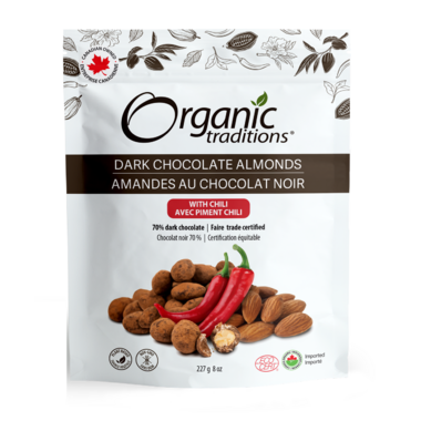 Organic Traditions Dark Chocolate Almonds with Chili is 70% dark chocolate and fair trade certified.