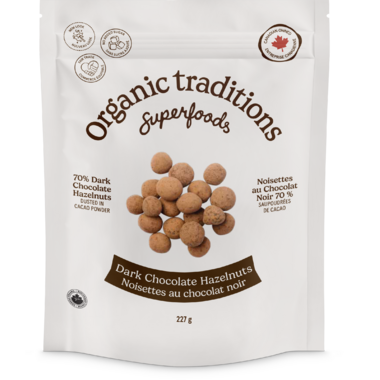 Organic Traditions Dark Chocolate Hazelnuts 70% Dark Chocolate and is fair trade certified.