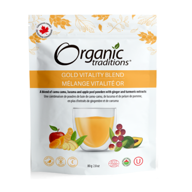 Organic Traditions Gold Vitality Blend is a blend of camu camu, lucuma and apple peel powders with ginger and turmeric extracts.