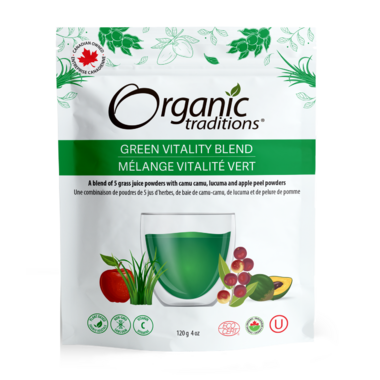 Organic camu camu powder, organic grass juice powder blend (alfalfa, barley grass, kamut wheatgrass, oatgrass, wheatgrass), organic lucuma powder, organic apple peel powder