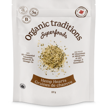 Organic Traditions Hemp Hearts with Omega-3 fatty acids, 10+ essential vitamins and minerals and 5g plant-based protein.