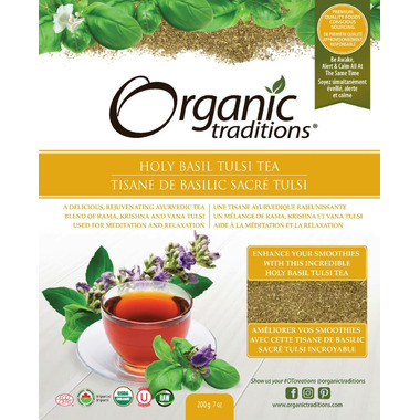 Organic Traditions Holy Basil Tulsi Tea is a delicious, rejuvenating ayurvedic tea with a blend of rama, krishna, and vana tulsi, used for meditation and relaxation.