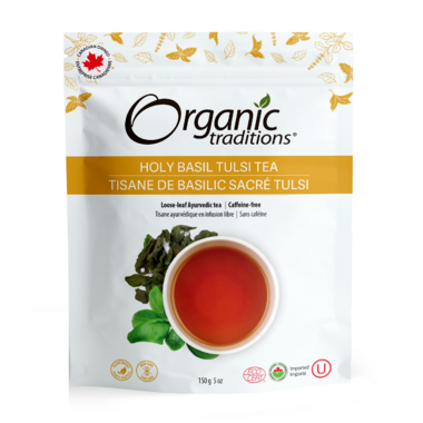 Organic Traditions Holy Basil Tulsi Tea is a loose-leaf Ayurvedic tea and is caffeine-free.