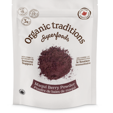 Maqui berries have long been revered by the Mapuche, the indigenous people of Central and Southern Chile. The Mapuche attributed their strength, health and longevity to this small purple-black berry. Maqui was traditionally used in the daily diet, in medicinal preparations and in the rejuvenating fermented tonic known as Chicha. Maqui berries are a source of Vitamin C. Flavonoids known as anthocyanins give maqui its rich purple pigment. Organic Traditions Maqui is freeze dried and cold milled with no fillers, flavours, or added sweeteners. Add to water, juice, smoothies or mix with yogurt, cereal and desserts.