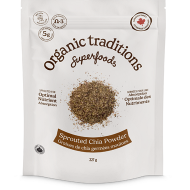 Organic Traditions Sprouted Chia Seed Powder is sprouted for optimal digestion, with Omega 3's and high in fibre.