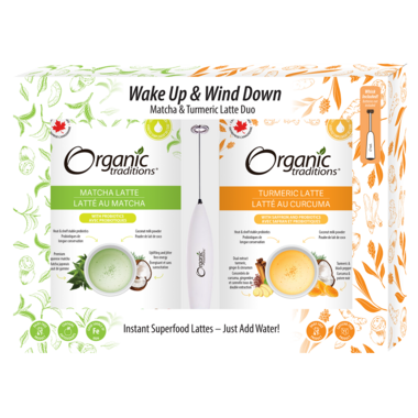 Organic Traditions Wake Up & Wind Down Latte Kit includes Organic Traditions Matcha Latte and Organic Traditions Turmeric Latte for the perfect duo. Includes latte mixer!