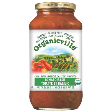 Organiville's Tomato and Basil Pasta Sauce combines the highest quality organic vine ripened tomatoes, fresh basil, fresh garlic, onions and oregano and extra virgin olive oil. It is perfect as a sauce on your favorite pasta shells or as a base for lasagne, spaghetti bolognese and meatballs.