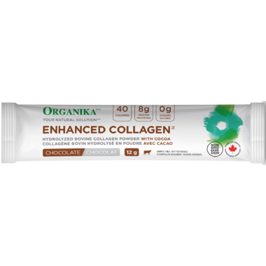 Collagen is the most abundant protein in healthy hair, skin, nails, and joints, providing them with strength, elasticity and tone. Organikas Chocolate Enhanced Collagen is a decadent chocolaty treat, with 8 grams of pure hydrolyzed collagen per serving, sourced from grass-fed cattle. Packed with protein and sweetened with stevia, it is a convenient better-for-you beverage, served hot or chilled.
