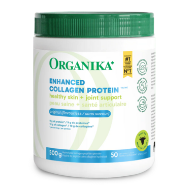 Restore and rebuild collagen with Organika's 100% pure, flavourless hydrolyzed collagen (peptides). Peptides are short chain amino acids naturally derived from collagen protein. These natural peptides are highly bio-available, digestible and soluble. Sourced from grass-fed cows, Organika's Enhanced Collagen is rBGH & BSE-free (no antibiotics or added hormones), with no artificial sweeteners or GMO ingredients. Amino acids glycine, lysine, & proline revitalize, firm and smooth skin.