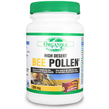 Bee pollen is a fine yellow powder that was once used for baking bread, colouring rice dishes and thickening soup centuries ago. Collected from flowering plants by honey bees, bee pollen is a substance containing vitamin B5. Organika®‘s High Desert Bee Pollen™ Tablets contains 250 mg of bee pollen, which provides 0.3 mg of vitamin B5.