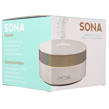 The Sona Diffuser works using ultrasonic technology to break up water and essential oils or aroma blends into extremely fine micro-particles, diffusing aroma into the air as mist without heat. With Bluetooth capabilities and high quality speakers, you can easily play music from your devices. Easily creates a calming and relaxing mood in your home or workplace.