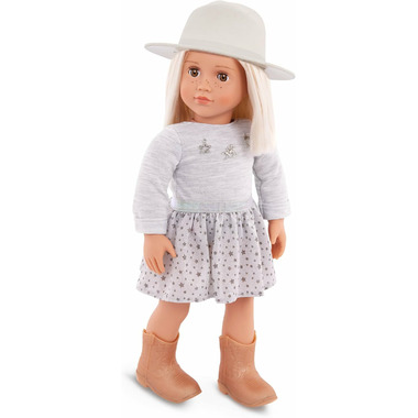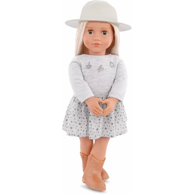 Our Generation doll Abigale lets kids blaze new trails in cute fashion! This country-style 18-inch doll has a huggable soft body and lifelike features to delight doll fans during playtime. Her beautiful hazel eyes open and close, and her long, platinum-blonde hair is fun to style in many ways! Abigale arrives in dazzling country charm that lets her personality shine. She wears a top with 3 dangling equestrian charms, a star-print skirt, a wide-brim hat, and cute boots. When it's time for dress-up, her outfit has easy-open closures to quickly put on and remove. So you can mix, match, and create more stylish looks on any adventure! Our Generation dolls make a great gift for kids ages 3+ (small parts), encouraging them to imagine their own unique stories.