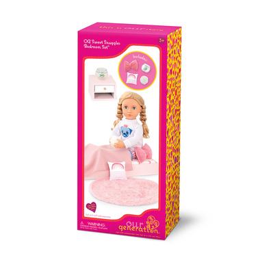 A 10-piece Modern Bedroom Set: reimagine your 18-inch doll's bedroom in beautiful style with the Our Generation Sweet Snuggles accessory set!