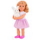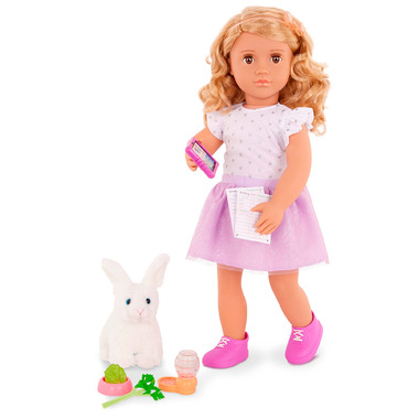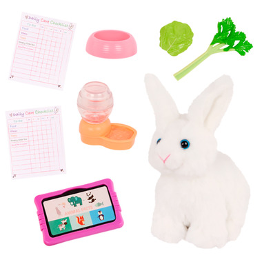 Double up on story-filled fun (and pet-tastic adventures!) with Tabby and her friendly pet bunny! This set includes bonus accessories like a food bowl, water dispenser, lettuce, celery, and 2 checklists to take care of her pet bunny. Tabby has a huggable soft body, wavy blonde hair thats fun to style, lifelike brown eyes that open and close, and is posable. Kids can bend her arms and legs to create fun poses during storytelling. She arrives wearing a heart-print top with ruffle sleeve caps, a bright purple skirt with a tulle overlay, running shoes, and a cute headband.