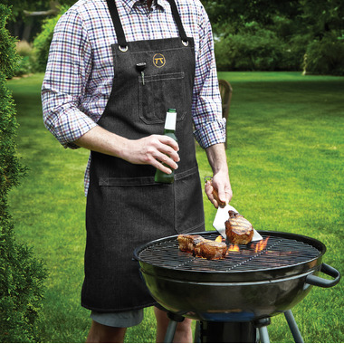 Keep the grill master, chef or mixologist clean and protected with this durable denim apron from Outset. This grilling, kitchen or bar accessory is both attractive and functional with its soft 100% cotton denim material, black cotton straps and antique brass hardware. It is carefully crafted to protect clothes from spills, splatters and grease; perfect for bartending, cooking in the kitchen or at the grill! Its one size fits most design is suitable for both men and women and includes dual shoulder straps that criss-cross and tie in the back, or around the waist. The functional apron is also equipped with a tong/towel strap and two deep front pockets... ready to store all the tools, condiments and accessories needed. Outset yourself in style with our exclusive grillware for outdoor (and indoor) entertaining. To the grill...to the bar...to the kitchen, in style!