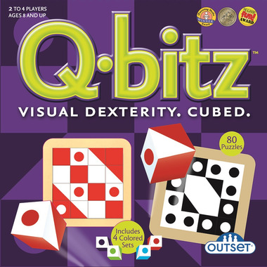 Q-bitz will challenge your visual agility! Players puzzle over how to recreate the patterns on the game cards using their set of 16 cubes. Three fast-paced rounds of play require different skills each timequick thinking, lucky breaks or memory muscle power. Each round is a race - the first player to correctly piece the pattern together claims the round and the card. Collect the most cards and you win!