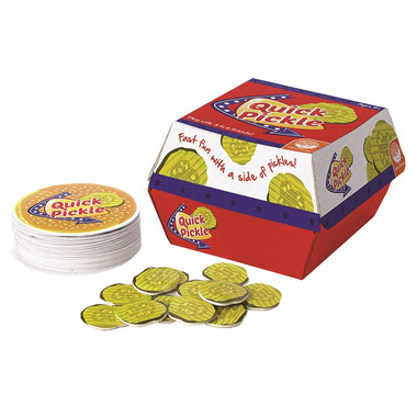 This fast-paced, family-friendly card game has you tossing toppings and collecting pickles as you complete categories, hold your nose or cover your mustard mouth! Flip a card and be quick to react to keep your pickle stash intact. Take too long or run out of rhymes and you’ll be passing pickles to your opponents. Even if you run low on pickles, you can always hope for a Pity Patty! The player with the most pickles at the end of the game wins. Includes 50 cards and 60 pickle chips.