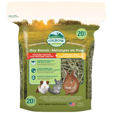 Small pets enjoy and benefit from variety in their daily diet. That's why Oxbow is so excited to offer our Hay Blends. Your pet rabbit, guinea pig or chinchilla is sure to love this enriching blend of premium Oxbow hays. They hand-select and blend Western Timothy and Orchard Grass to create the perfect blend of tastes and textures. Your pet should have unlimited grass hay every day. Place large handfuls of grass hay in your pets habitat daily. This product contains two types of grass hays together to enrich your pet's diet.